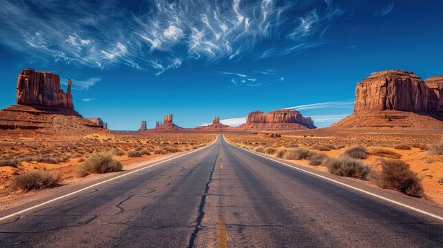 Scenic desert road leading to jagged red rock formations