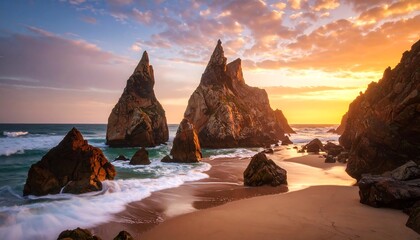 Majestic rocky shoreline at sunset with dramatic sky and smooth waves