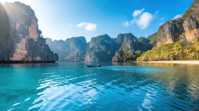 A tourist boat navigates the clear turquoise waters near dramatic limestone cliffs on a sunny tropical island
