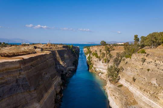 Wide view of the Corinth Canal with steep limestone cliffs on both sides, turquoise water below, and dry terrain under a clear blue sky. Sparse vegetation and distant mountains enhance the dramatic