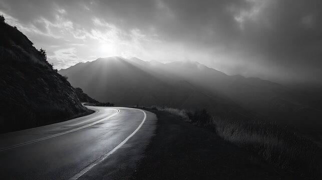 A lonely road winding through a vast foggy mountain range at dawn, sun rays breaking through the clouds, dramatic and epic mood, cinematic landscape photography, with a clean sky for text, 8k