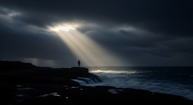 Sun rays breaking through dark storm clouds over ocean create dramatic and beautiful scene, evoking sense of hope and tranquility