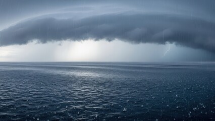 Lightning bolts strike the sea under dark and stormy clouds, creating a dramatic and powerful scene