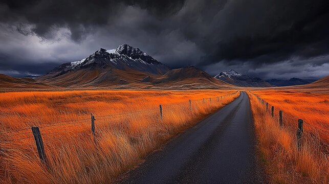 A narrow asphalt road extends through vibrant orange fields under a dramatic dark cloudy sky with majestic snow capped mountains