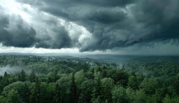 Dramatic storm clouds over a dense forest