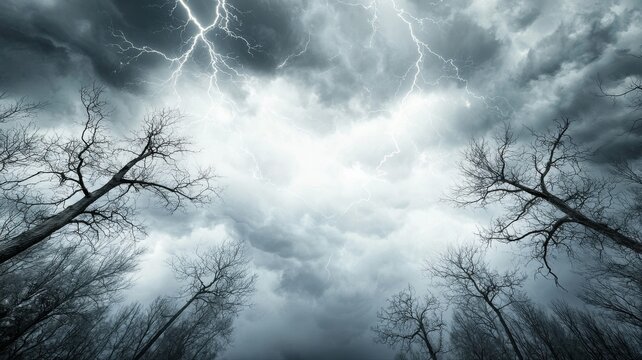 Dramatic Lightning Storm Over Bare Trees lightning storm trees bare dark sky clouds weather nature