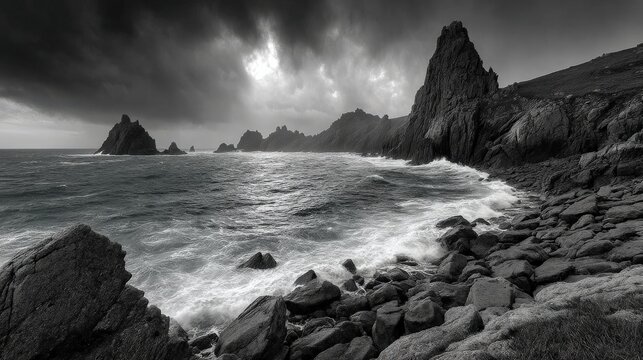 Dramatic coastal landscape with stormy skies and rocky shoreline