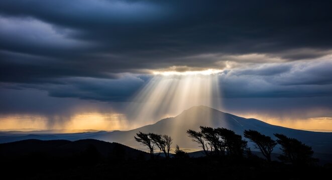 Sun rays breaking through dramatic stormy clouds over a majestic mountain landscape