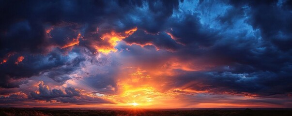 Sunset behind dramatic clouds with sun rays illuminating sky