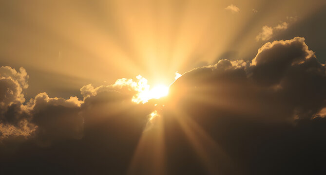 Golden sunset sun rays illuminating fluffy cumulus clouds