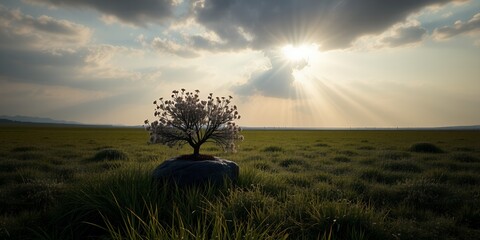 Lone tree stands resilient in a vast open field under dramatic sunbeams breaking through stormy clouds