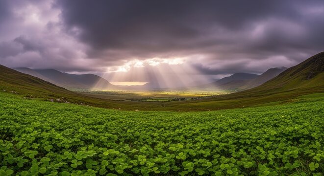 dramatic mountain landscape with sun rays breaking through stormy clouds and golden fields