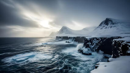 Stormy coastline with dramatic rocky cliffs and turbulent waves
