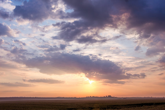 Dramatic sunset with vibrant clouds over open field