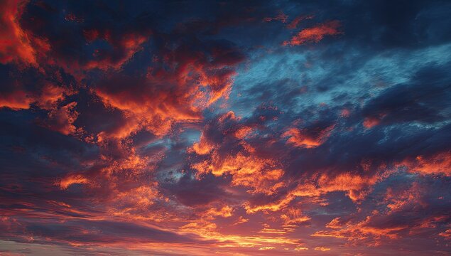 A vibrant, swirling depiction of a sunset sky, featuring layered clouds in various shades