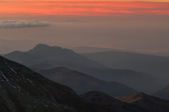 Aerial view of the dramatic, layered mountains painted in hues of twilight with the peaks piercing the fading light, from Bystra, Zilina Region, Slovakia.