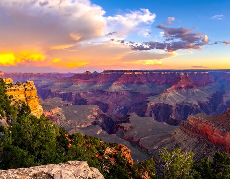 Expansive canyon landscape with vibrant sunset colors and layered rock formations