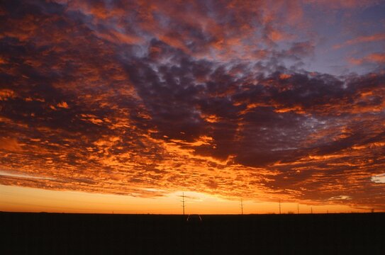 Sunset sky with dramatic red and orange clouds silhouetting rural landscape