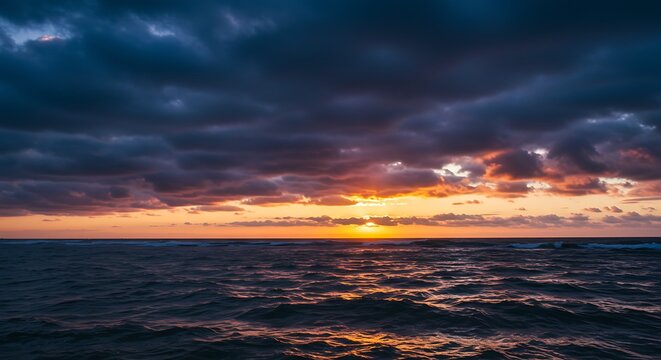 Dramatic sunset over ocean horizon with stormy clouds