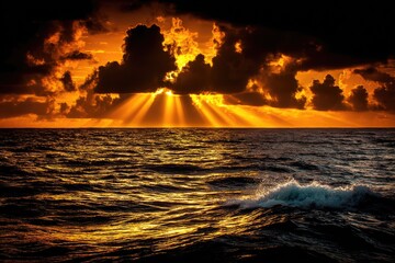 Dramatic sunset over ocean horizon with sunrays and waves