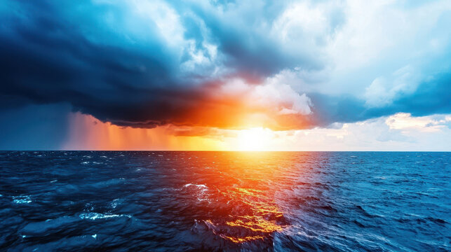 Dramatic sunset over ocean with storm clouds and calm water reflecting sky