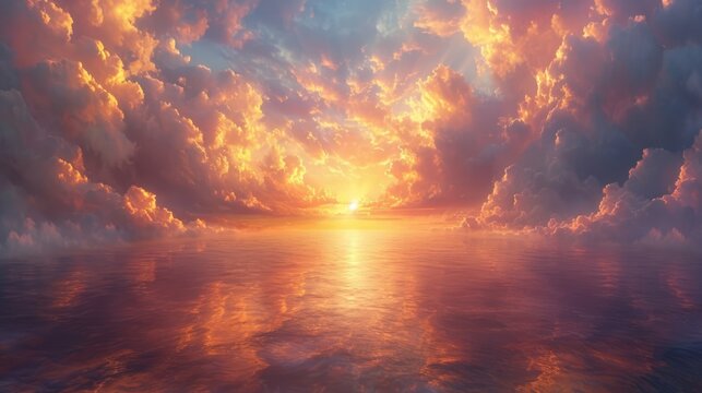 Fiery sunset over tranquil sea, with radiant clouds and sun beams creating a breathtaking, dramatic skyscape.