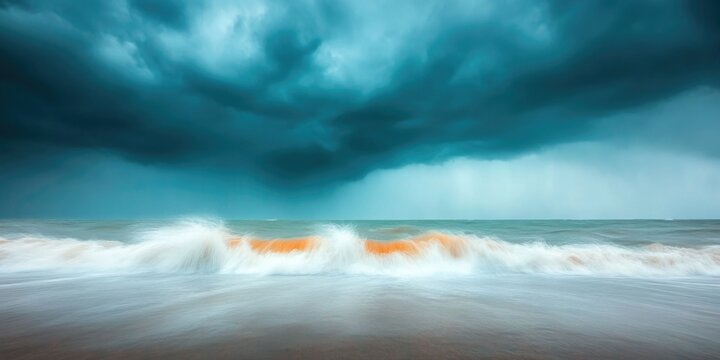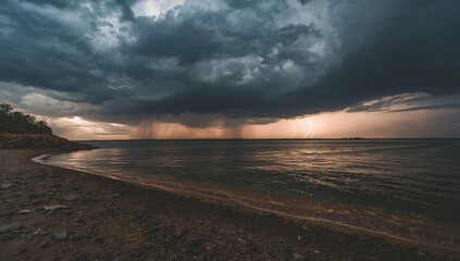A stormy beach scene with dark clouds over the ocean, waves crashing onto the shore, and a moody sky with a hint of sunset lighting.