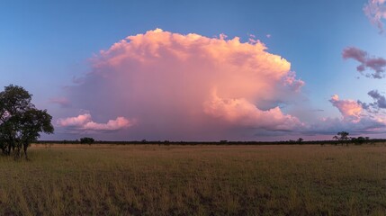 Dramatic glowing cumulonimbus clouds in pink purple twilight