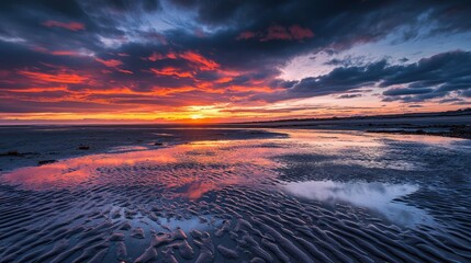 Stunning sunset over sandy beach with vibrant colors and reflective water at low tide under a dramatic sky