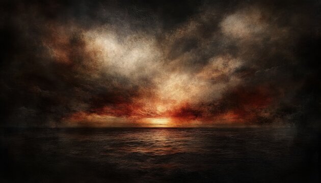 Dramatic sunset over a stormy sea.  A fiery, ominous sunset bleeds across a tumultuous sea, shrouded in ominous clouds