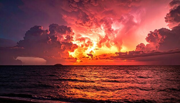 Dramatic red and orange clouds over dark ocean waves at sunset or sunrise scene with vibrant colors