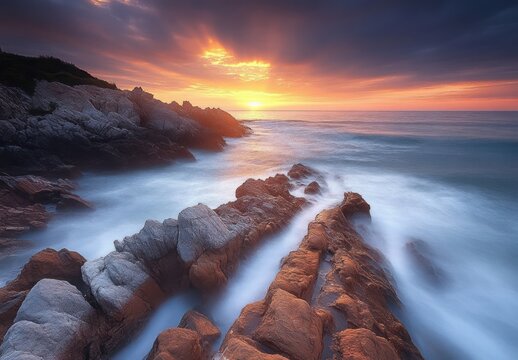 Dramatic rocky coastline at sunset with golden sun breaking through clouds and misty sea waves flowing over jagged rocks