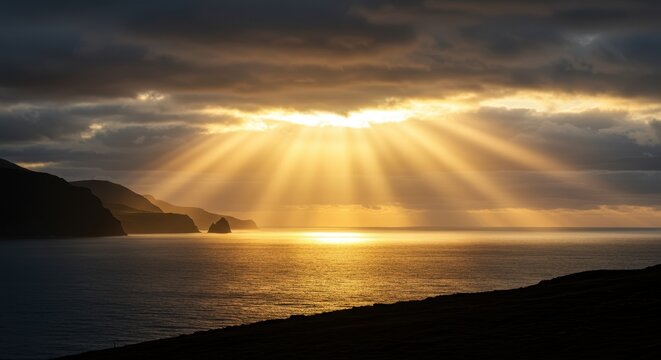 Golden sunlight breaking through dramatic dark clouds over a coastal ocean landscape at sunset