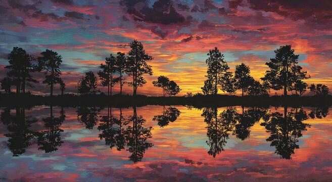 Colorful sunset reflecting on calm water, silhouetted trees