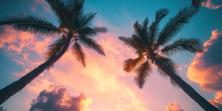 Tall coconut trees are beautifully captured from below in a landscape setting during dusk, showcasing the elegance of tall coconut trees against a vibrant sky.