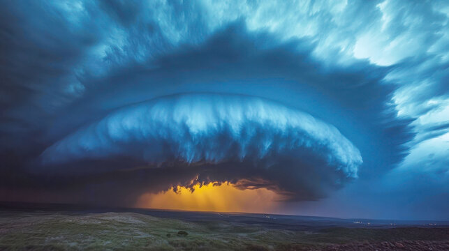 Massive supercell storm cloud forming over a vast open landscape with dramatic lighting and dark blue swirling sky at sunset