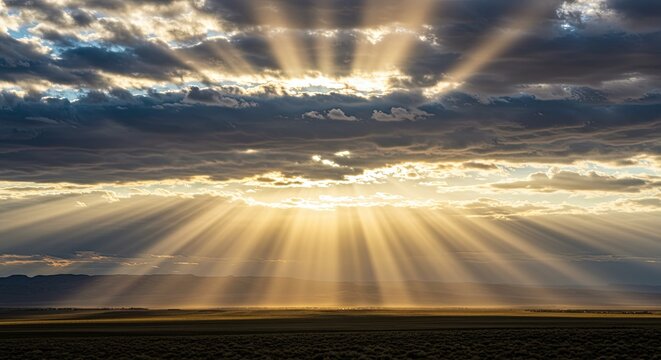 Ethereal light breaking through storm clouds over expansive golden field scape