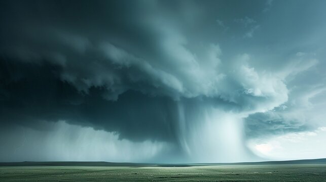a dramatic storm over vast prairies, with dark clouds, lightning strikes and heavy rain