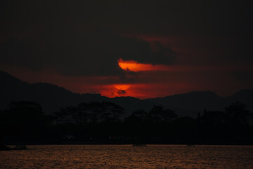 Dramatic sunset with dark clouds over lake