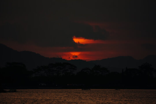 Dramatic Sunset With Dark Clouds Over Lake Images