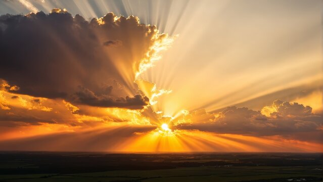 Dramatic sun rays breaking through clouds at sunset