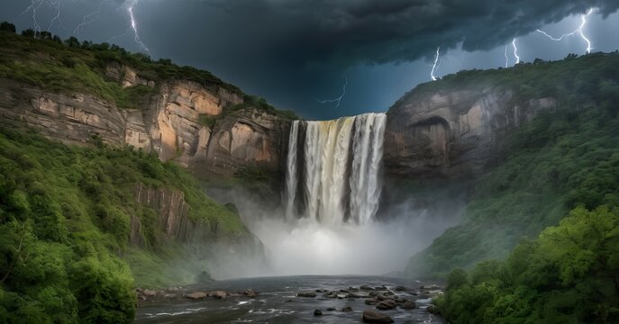 Waterfall during a thunderstorm with dramatic clouds and lightning in the background