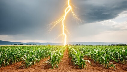 Lightning bolt strikes a cornfield under a stormy sky