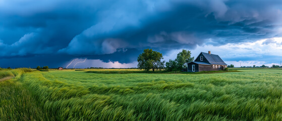 Stormy Countryside Scene with Lightning Bolt Striking Behind Rustic Farmhouse and Lush Green Wheat Field Under Dramatic Cloudy Sky