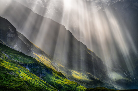 Nature and landscape  in the spring. Landscape with dramatic sky and green meadows. The sun rays through the clouds. The Hohe Tauern mountain range, the valley below the hochalpenrstrasse.