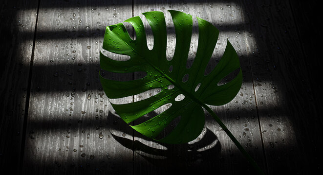 Monstera leaf with glistening water droplets, dramatically highlighted by window light and shadows on dark wood.