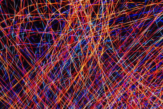 Colorful light painting abstract long exposure image with pink, blue, red and yellow lines on a black background