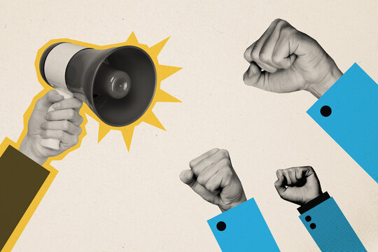 Trend artwork composite sketch image collage of silhouette leader hand hold loudspeaker bullhorn arms appear wrist fist up crowd group