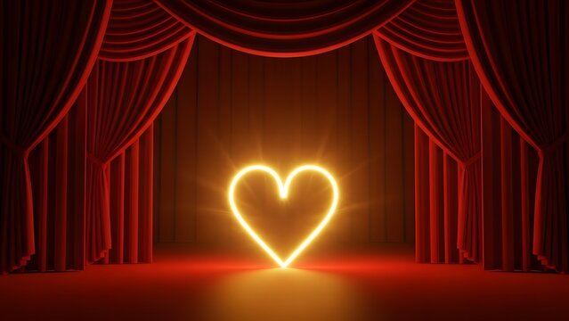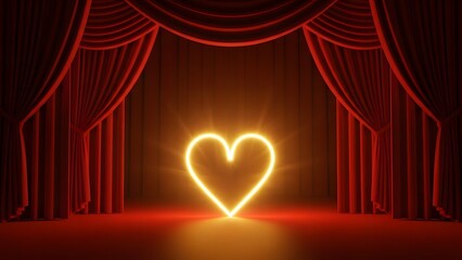 Neon heart glowing brightly on a dark stage with illuminated red theater curtains background