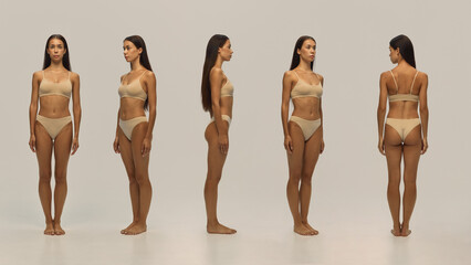 Collage of female model in beige lingerie shown from multiple angles against neutral background for body reference and apparel design. Concept of fashion catalog, fit guide, clothing industry.